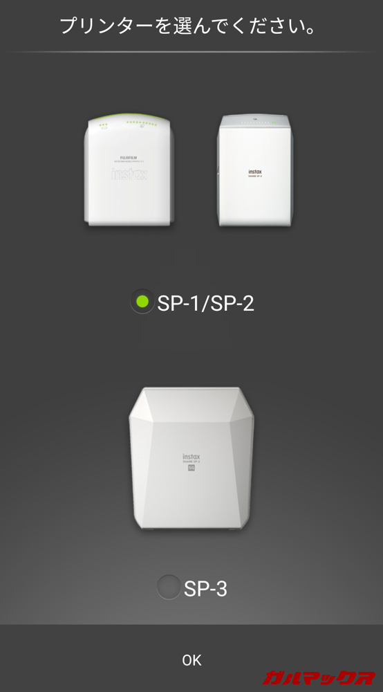 ▼アプリを起動すると接続する機種の選択画面が出力します。SP-3は利用したことがないのですがスクエアサイズと普通のチェキサイズの違いでアプリ内のデザインが違うんだと思います↓