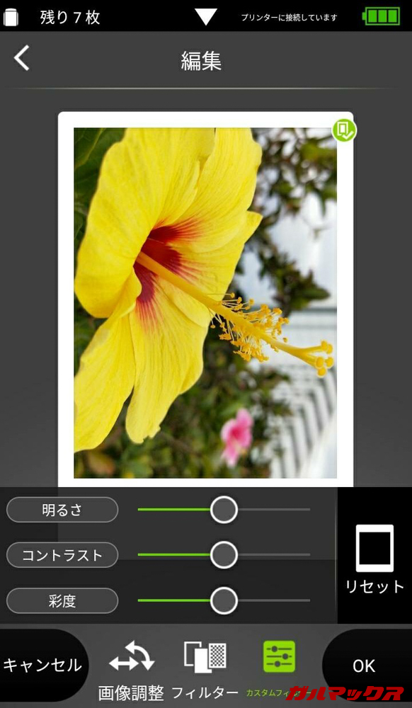 ▼スマホアプリで写真を選択して、あとはそのまま印刷するもよし加工するもよしです。こんな感じでスマホアプリで「明るさ」「彩度」「コントラスト」の変更ができます。