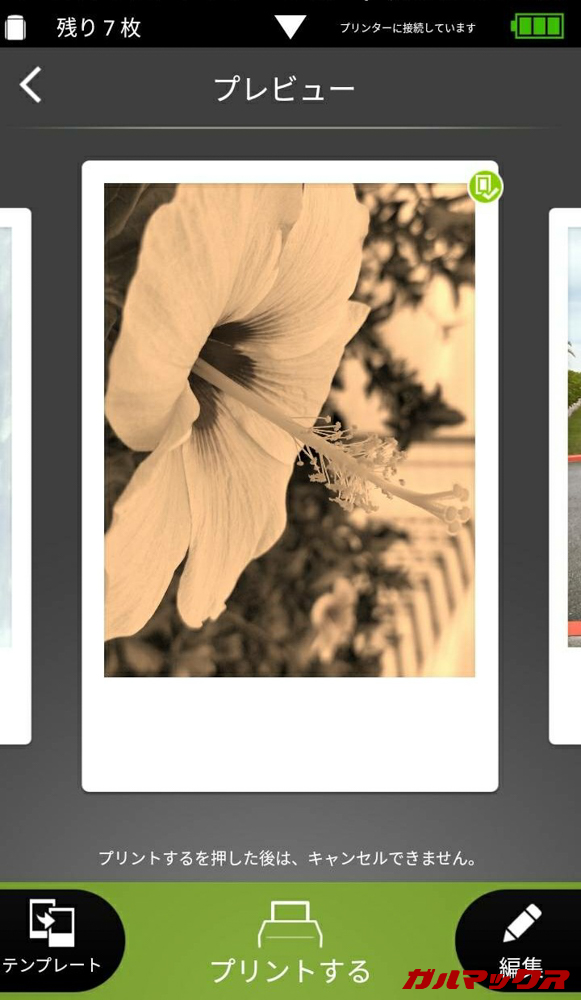 チェキと違って加工して印刷できるのが魅力ですね。ワンタッチでセピア色に加工できます。↓