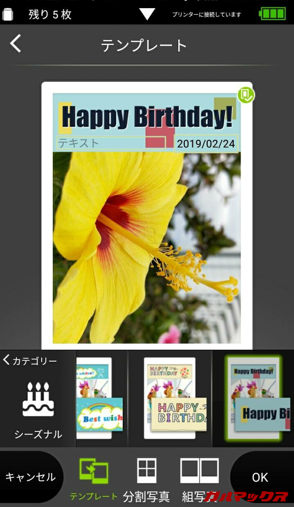 最大の魅力はアプリで加工してチェキフィルムに印刷できることです。日付を入れたり、誕生日や結婚式のコメントを入れたりすることが可能です。↓