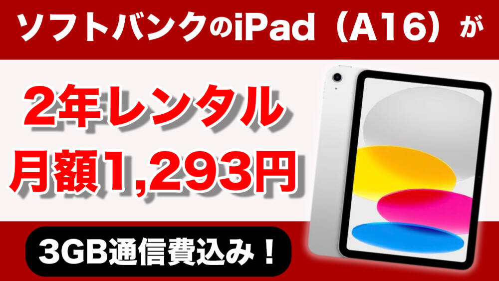 新規OK。2025年発売のiPad(A16)がソフバンで2年レンタル月額1,293円、3GB通信費込み