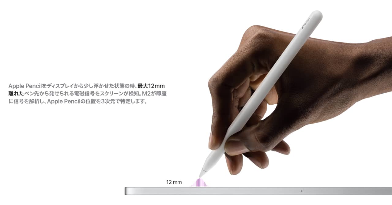▼またApple Pencilは検知範囲がアップしており、ディスプレイから最大12mmまで浮いてても電磁信号で検知できるようになっているそうです!ますますペン操作が捗りそう。イラストレーターさんにも試してみてほしい。↓