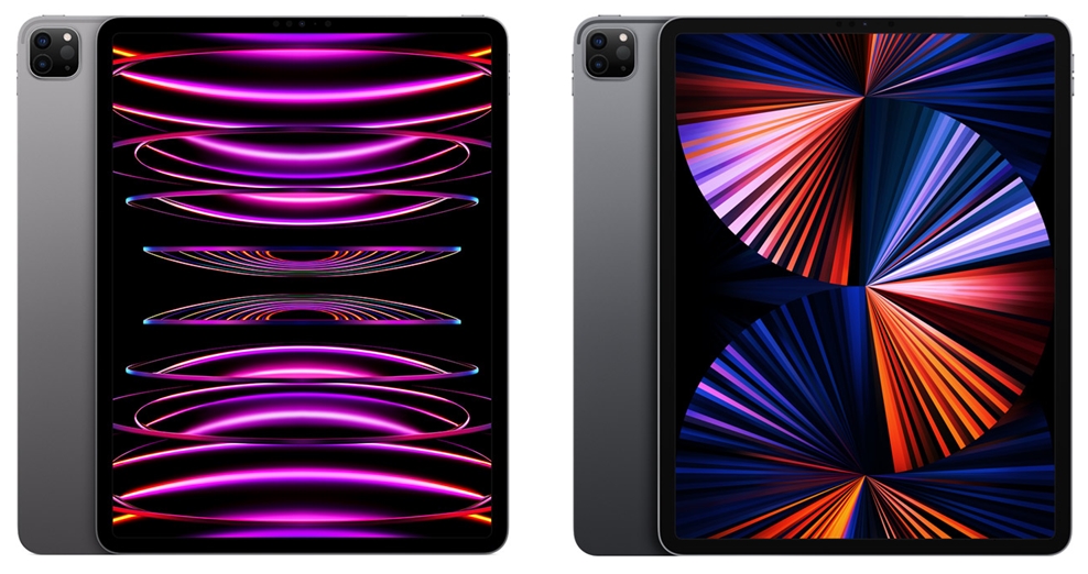 外観デザイン、寸法、カラー構成はどちらも同じですが、iPad Pro 2022 第6世代 12.9インチは上部のラインが薄くなっている、という違いがあります。