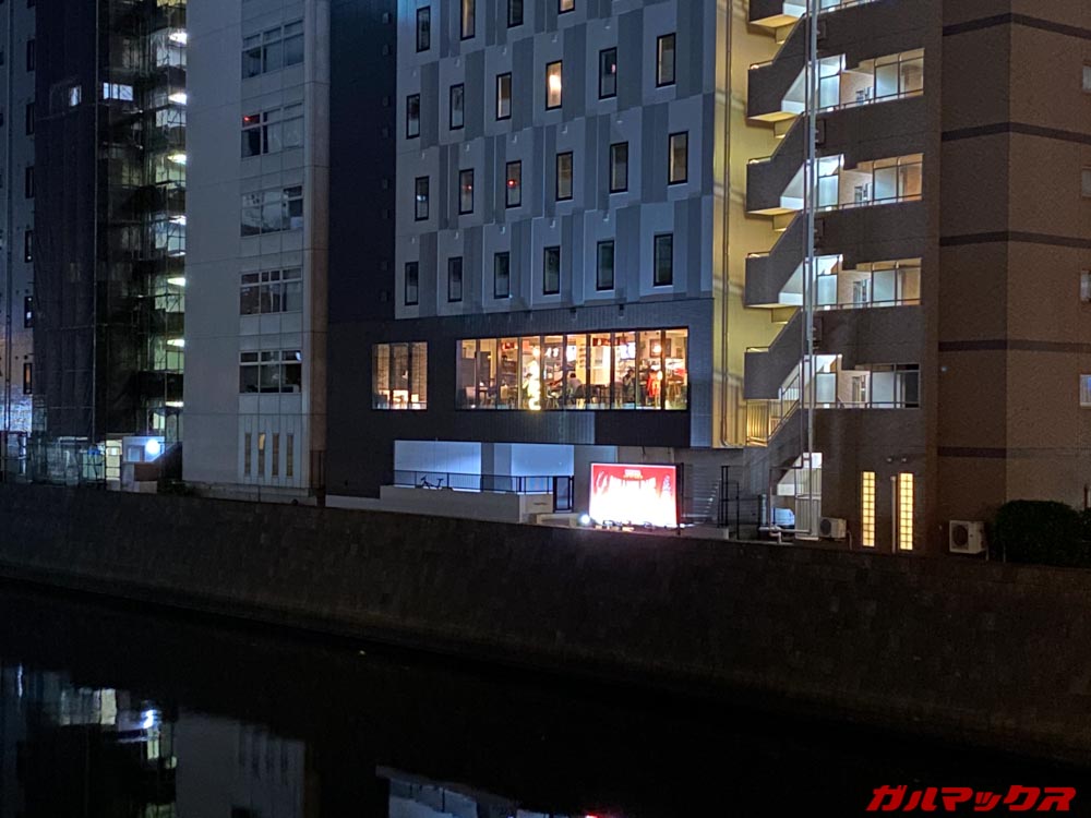 まずは通常カメラでの撮影ですが、どちらもナイトモードでの撮影です。もともと目視だとほぼ真っ暗な状態なのですが、建物の色合いはiPhone 12 Proがより忠実。iPhone 11は全体的に青っぽいですね。