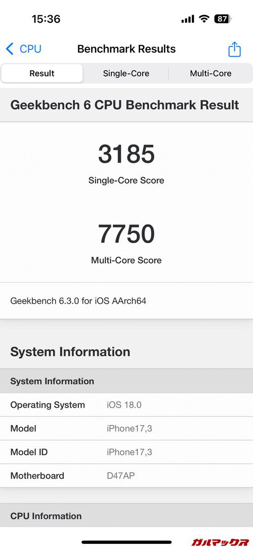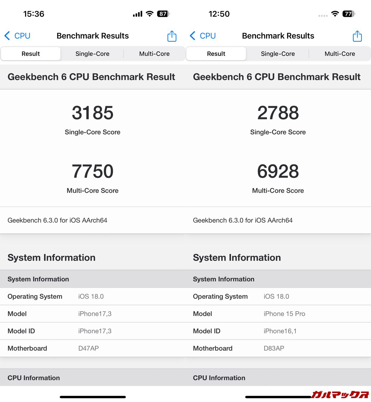 ▼CPU性能が向上しているようで、Geekbench 6ではシングル・マルチともにA17 Proを上回る結果に。左がiPhone 16のA18、右がiPhone 15 ProのA17 Pro。↓