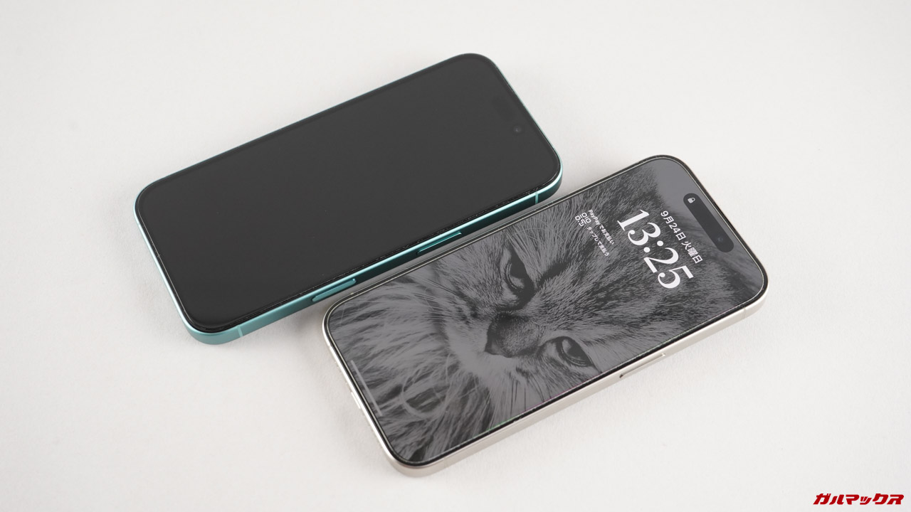 ▼画面サイズは6.1インチ。iPhone 15 Proと同じ画面サイズなので持った印象は変わりません。↓