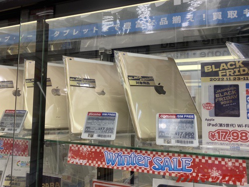 ▼2022/11/26追記:じゃんぱら三宮センター街店へセール初日に行ってみたのでチェックしてみたところ、iPad(第5世代) Cellularモデルは本体のみで付属品は付いていないものの、ランクはAと中古としてはかなりキレイなものが揃っていました。↓