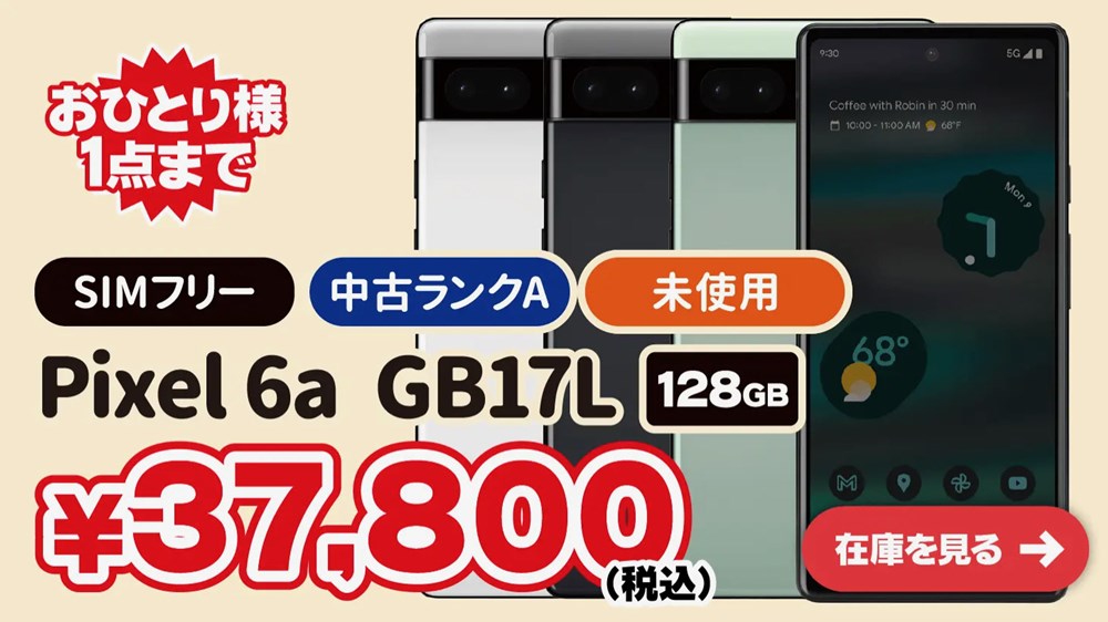 SIMフリー版Pixel 6a 未使用品・中古:37,800円