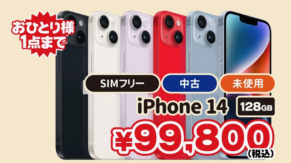 iPhone 14 128GB 未使用品・中古(SIMフリー):99,800円