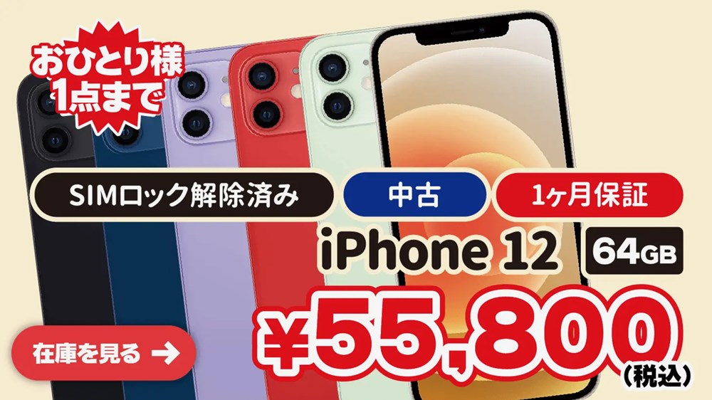 iPhone 12 64GB 中古(SIMロック解除済み):55,800円