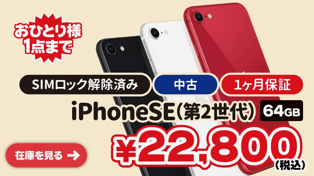 iPhone SE(第2世代) 64GB 中古(SIMロック解除済み):22,800円