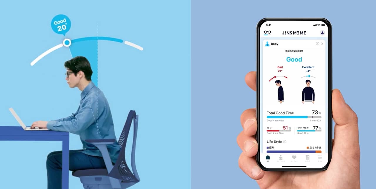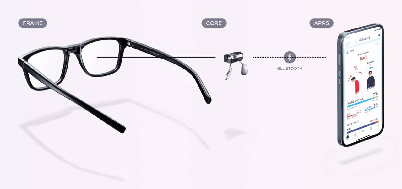 ▼JINS MEMEの鼻掛け内部に搭載されたセンサーは人体の動きや目の視線を検知。さらにはストレスといった心の状態も測定してくれるそうです。それにより姿勢改善やストレス緩和など健康管理に役立てられるという仕組み。思った以上にスゲーな!↓
