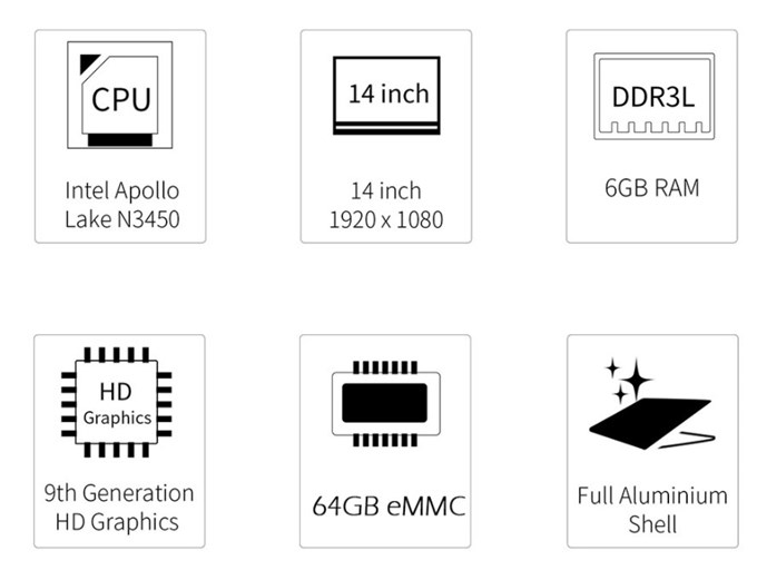 Jumper EZbook 3L ProのOSは日本語化が簡単に出来るWindow 10、処理性能を左右するCPUはIntel N3450、メモリは6GB、画面サイズもほぼ同じ14型(1920×1080)。