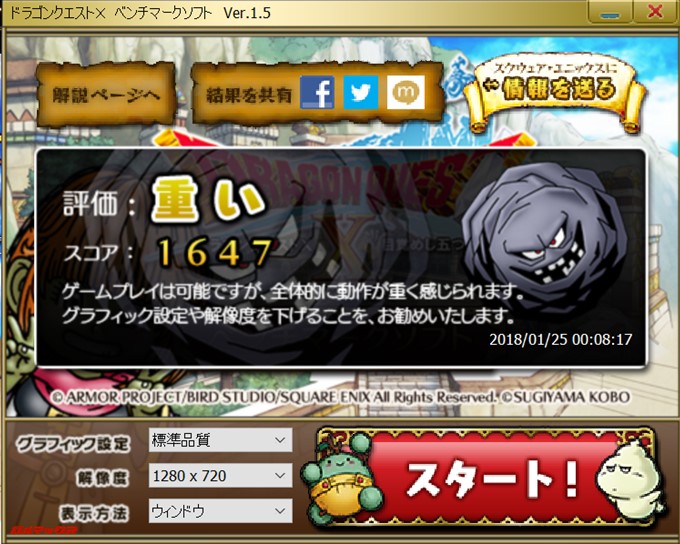 ドラクエXのベンチマークテストを行いましたが、HDの標準画質で【重い】、HDの低画質で【やや重い】となりました。