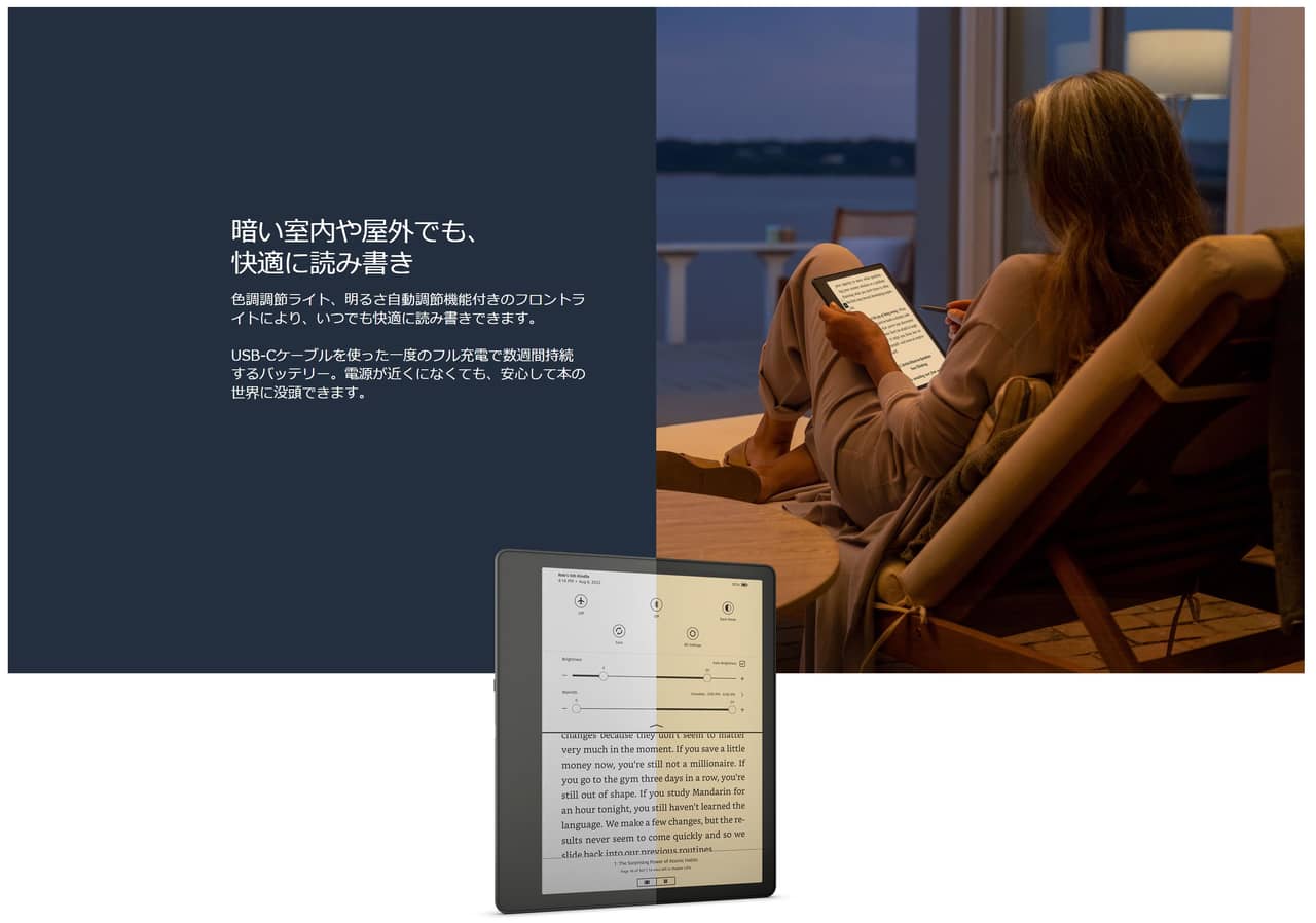 ▼ディスプレイサイズは10.2インチの大型サイズで高精細な300ppi。E-Ink(電子ペーパー)は色調節ライトや明るさ自動調整機能付き!薄暗い場所でもめちゃ見やすそう。↓