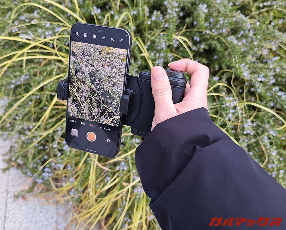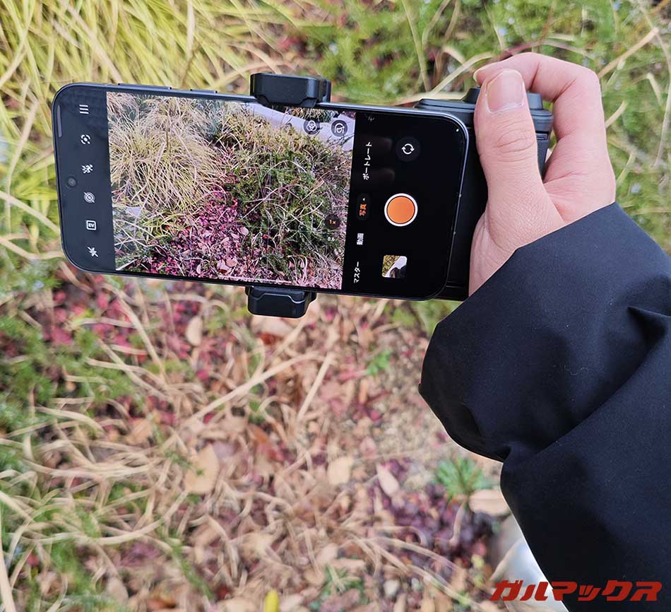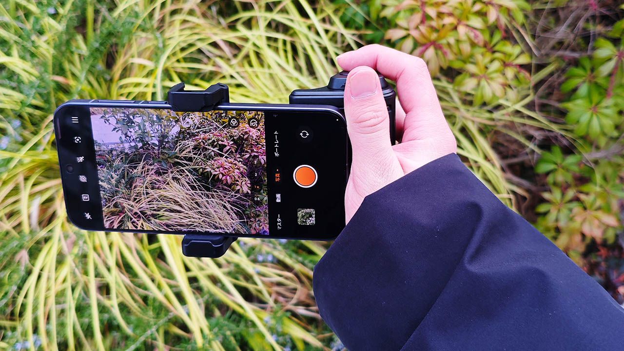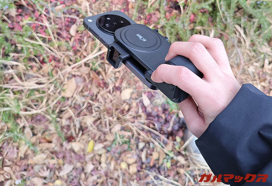 スマホ単体で撮影する場合、両手で持つか片手で掴むかぐらいしか選択肢がないので、どうしても角度や向きに制約が生じます。Xiaomi 14 UltraのPhotography Kitもそうですが、グリップがあることで手首を回すだけで自在に角度を調整でき、とても便利です。特に、手を伸ばして低い位置を撮影したいときなど、スマホ単体とグリップありでは顕著な差が出ます。