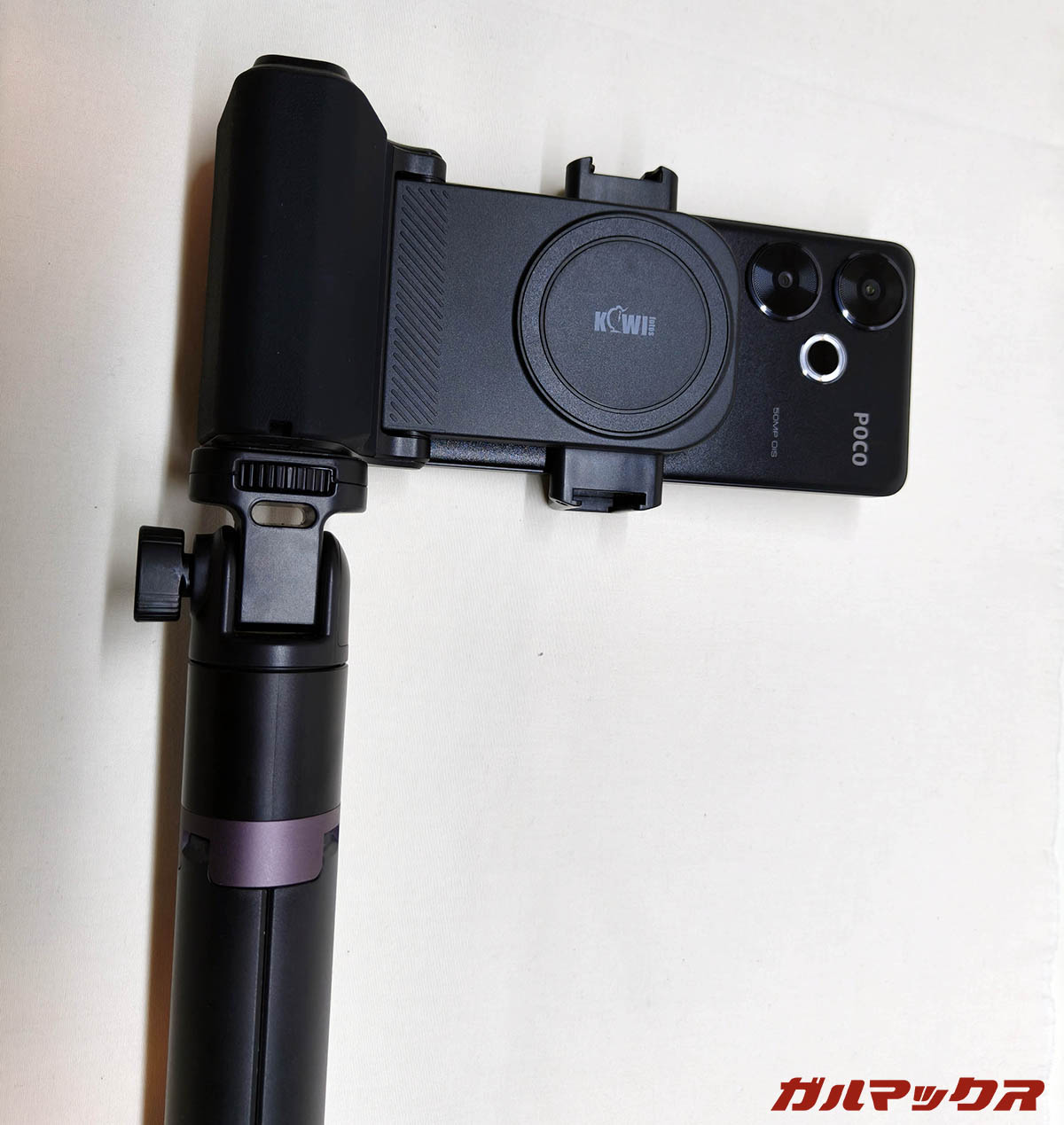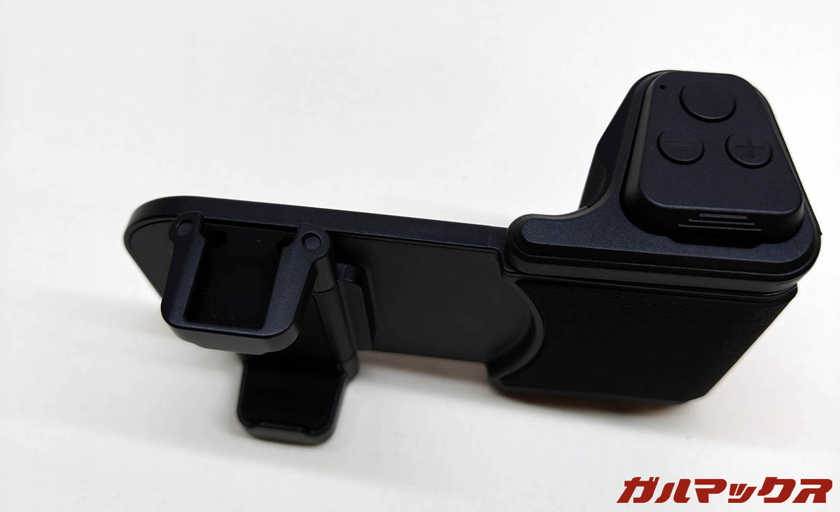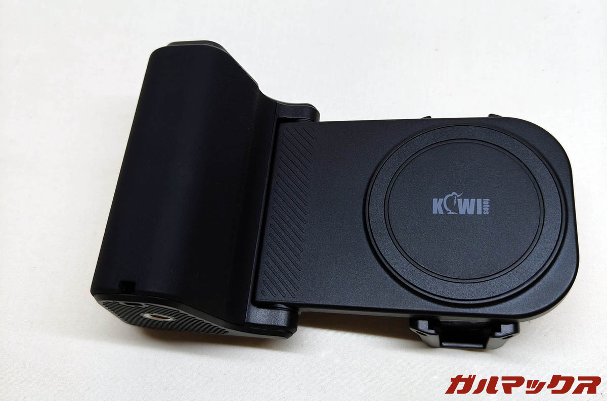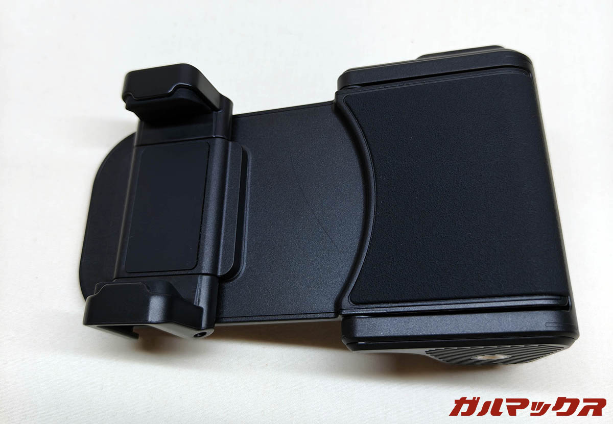 ▼後面。左側のグリップ部分にスマホを挟んで使用します。グリップは360度回転するので、スマホは縦向きでも横向きでも利用できます。無段階で回転しますが、90度ごとにしっかり止まるので、スマホの重みで回っちゃうようなこともありません。↓