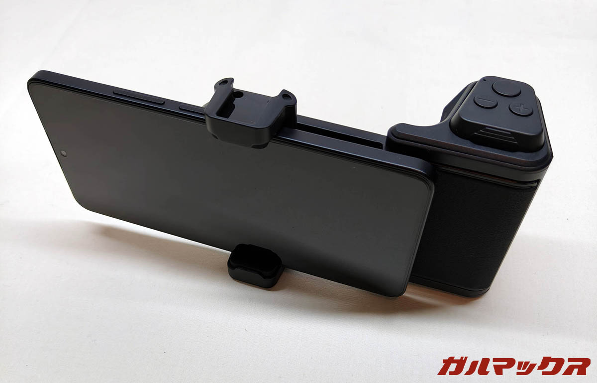 ▼重量は138g、スマホを合わせても350g程度なので重さはあまり気になりません。素材はABSとシリコンなので握り心地は良いです。ただ、グリップはしっかり大きさがあるので、手が小さい方はちょっと持ちにくいかも?↓