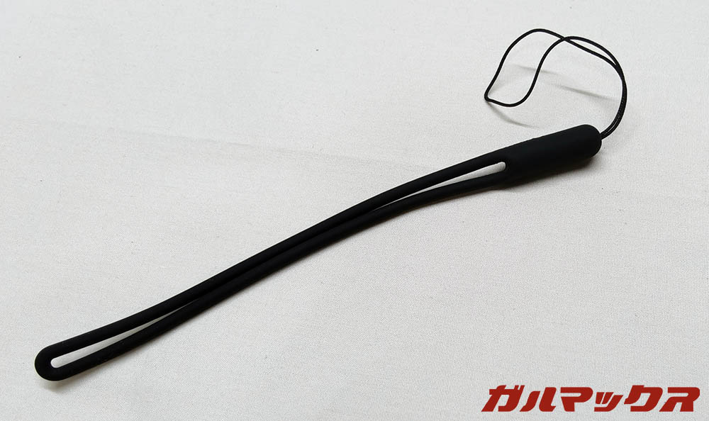 ▼付属品のストラップはゴム製。質感はイマイチ。↓