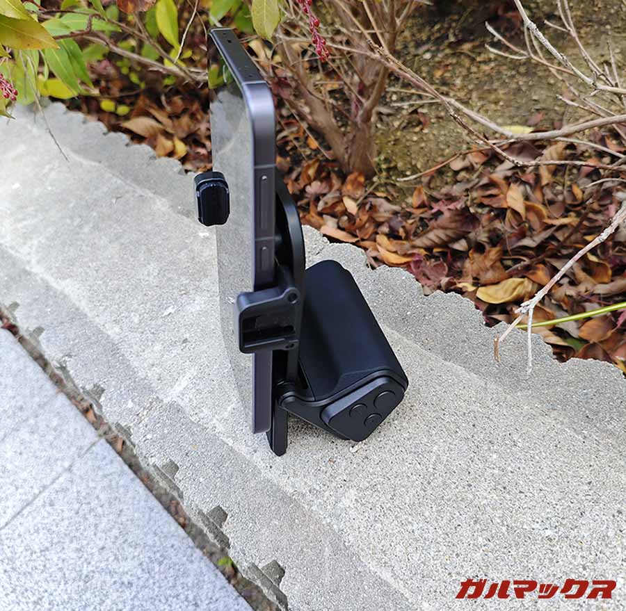 ▼グリップ部分を曲げることでスマホスタンドとしても利用可能。リモコン部分を取り外せば自撮りも簡単にできます。↓
