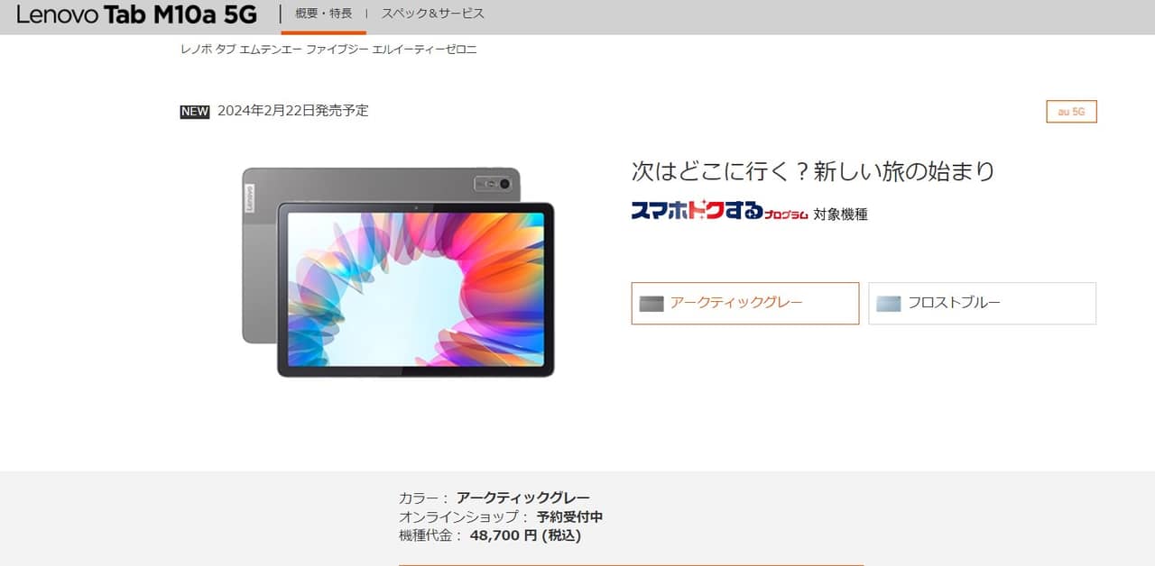 auから10.6型タブレット「Lenovo Tab M10a 5G LET02」が2月22日より発売すると発表されました!価格は48,700円ですが、スマホトクするプログラムの利用で実質負担金は29,900円になるそうです!