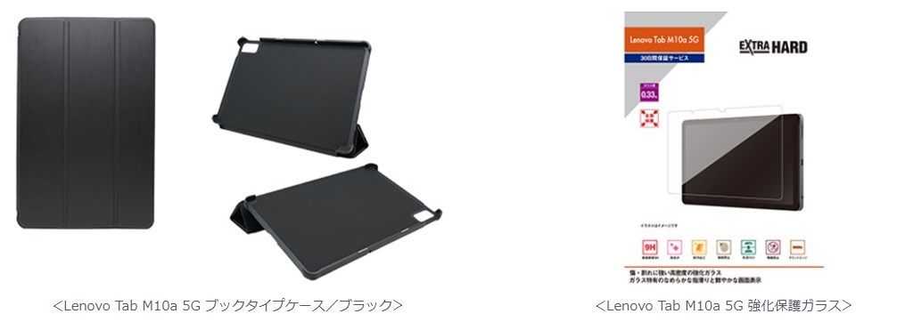 また、au公式アクセサリーとして2つのアングルで利用できるスタンド機能付きの「Lenovo Tab M10a 5G ブックタイプケース/ブラック」、30日間保証サービス付きの「Lenovo Tab M10a 5G 強化保護ガラス」も販売するとのことです!