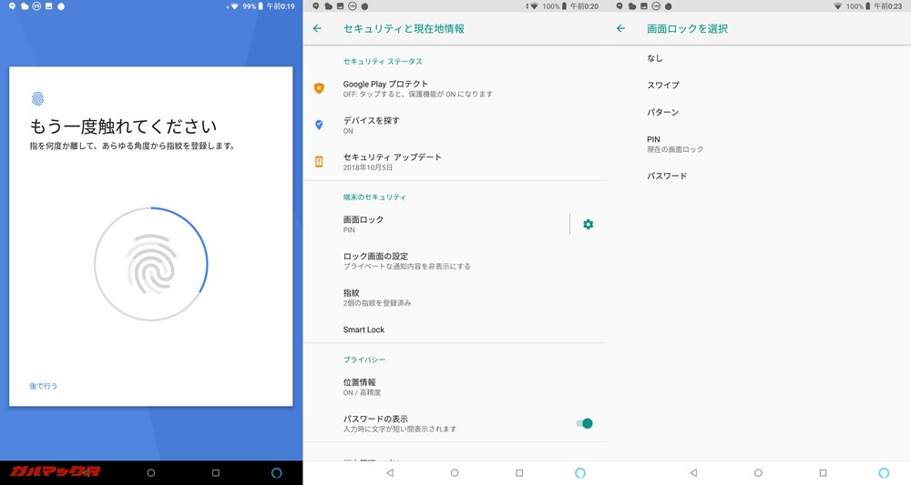 ▼指紋の登録は設定アプリから「セキュリティと現在地情報」→「端末のセキュリティ」内の「指紋」から登録してください。なお、認証が通らなかった時のためのパターンやPIN、パスワード入力もしないといけませんので、キチンと設定をしておきましょう。↓