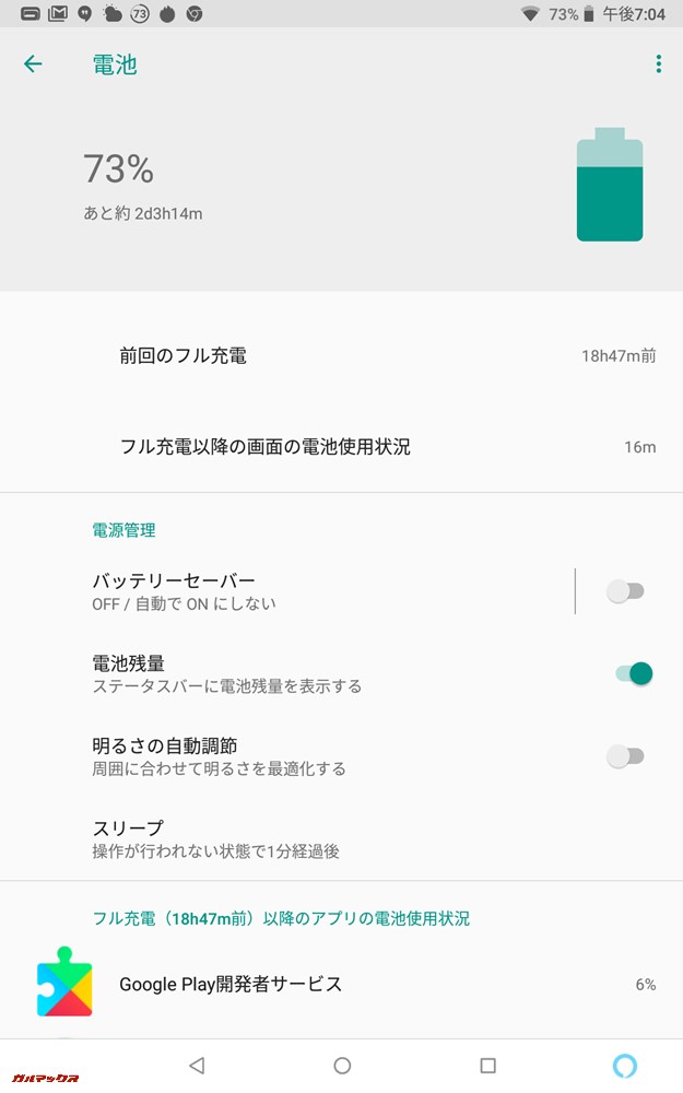 ▼19時間弱の稼働(9割スリープ状態)で残量は73%でした。iPadなどとは違い、スリープ状態でもバッテリー残量がそこそこ減っていたので、体感的にも特別長持ちだなぁと感じるものではなかったです。かといって悪いわけではないので、Androidタブレットとしては普通ぐらいだと思ってもらえたらと。↓