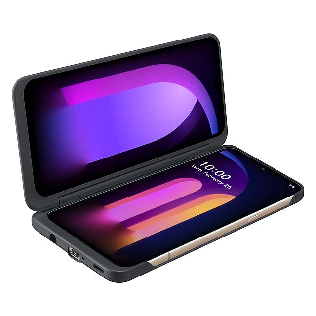 ▼LG V60 ThinQ 5Gの一番の特徴、それは専用ケースにあり。専用ケースは一見するとただの手帳型ケースなんですが、カチョっとハメ込めば2画面スマホに変身!