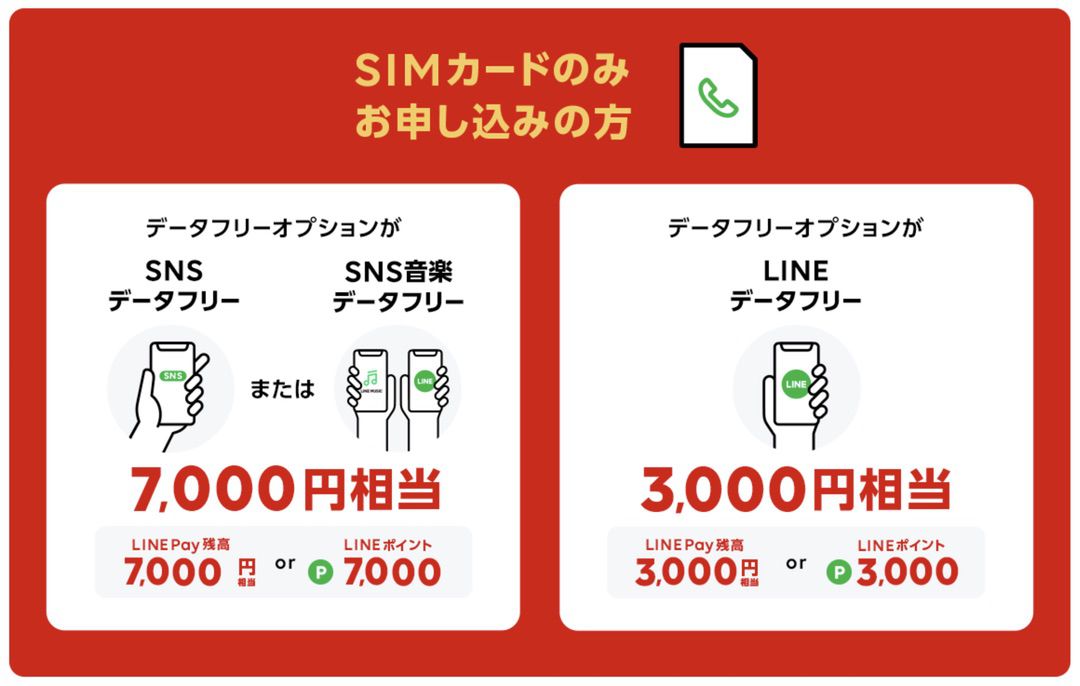 ちなみに公式サイトを確認する限り、SIMのみでの申込みだと最大7,000円相当の特典、端末セットだと最大1,000円相当の特典と内容がことなるようなので、ここはSIMのみを狙っていこう。