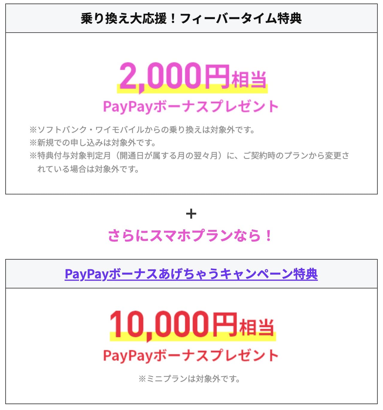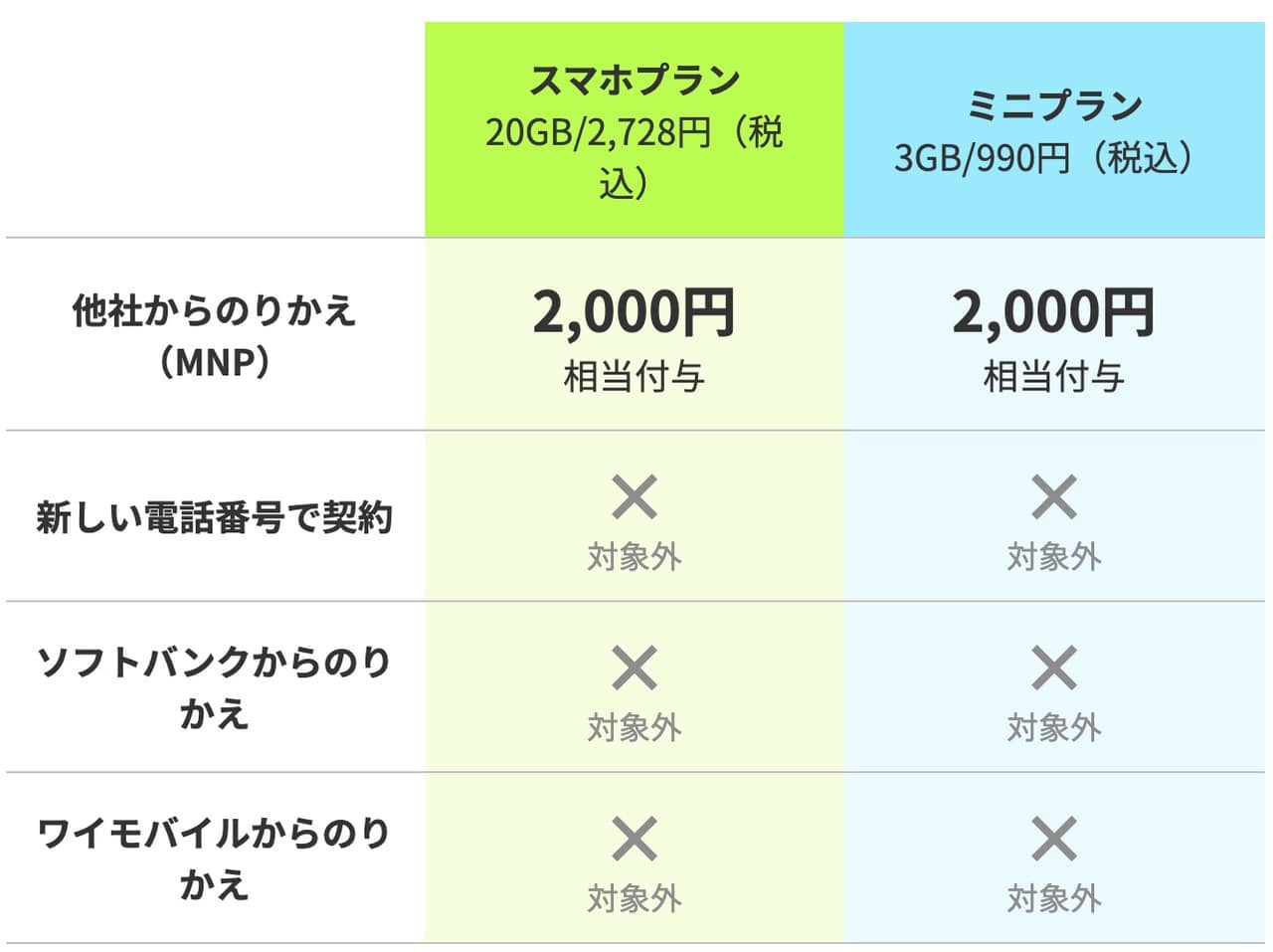 残念ながら「ミニプラン」は対象外で「スマホプラン」のみ対象。他社からの乗り換えが対象なのでご留意を!↓