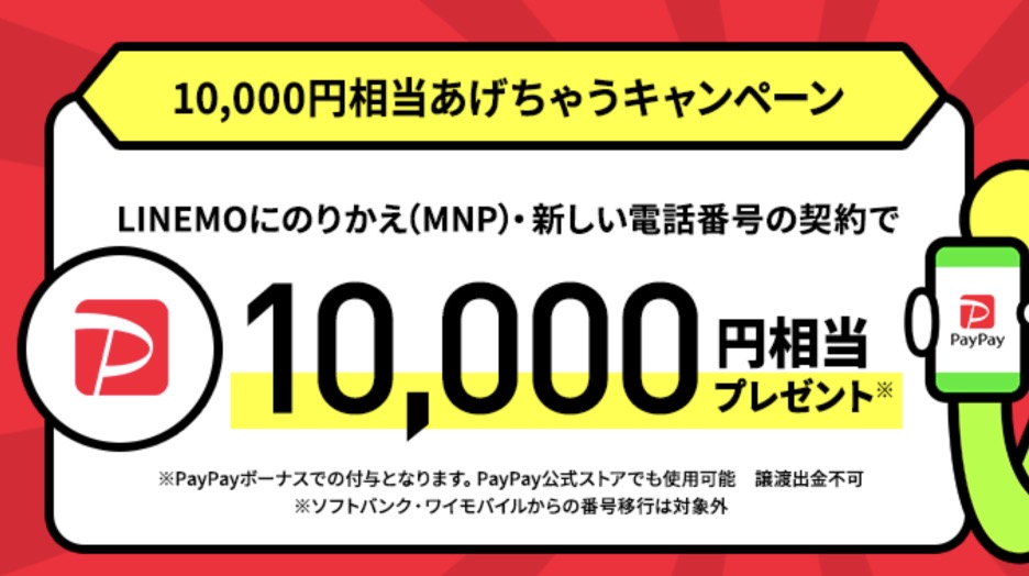 ソフトバンクのオンライン専用ブランド「LINEMO」でお得なキャンペーンが開催です!10,000円相当のPayPayボーナスが貰えるので、検討している方はお得に申し込みましょう!