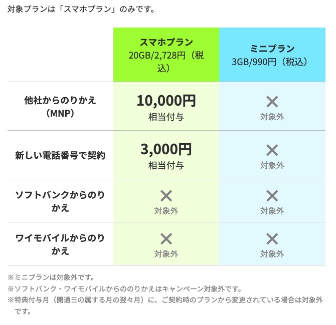 ▼あと、残念ながら3GBまで使えるミニプランは本記事で紹介しているキャンペーンは対象外。また、ソフトバンクやワイモバイルからの乗り換えも対象外なのでご留意下さい!↓