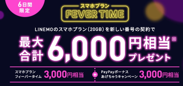 新しい番号での新規契約では3,000円相当とややしょっぱい感じはありますが、2022年1月19日11時59分まで開催されているフィーバータイムキャンペーンを併用すると6,000円相当貰えますよ!