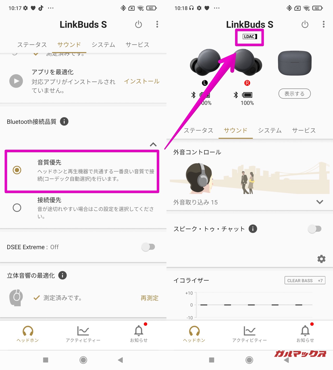 確かにサービス的にはLDACで無くても良いっちゃ良いんですが、連携をオンにすることでLDACで接続したいゲームや動画視聴時にわざわざ操作しなくちゃいけないのが面倒だなーって感じたポイントです。