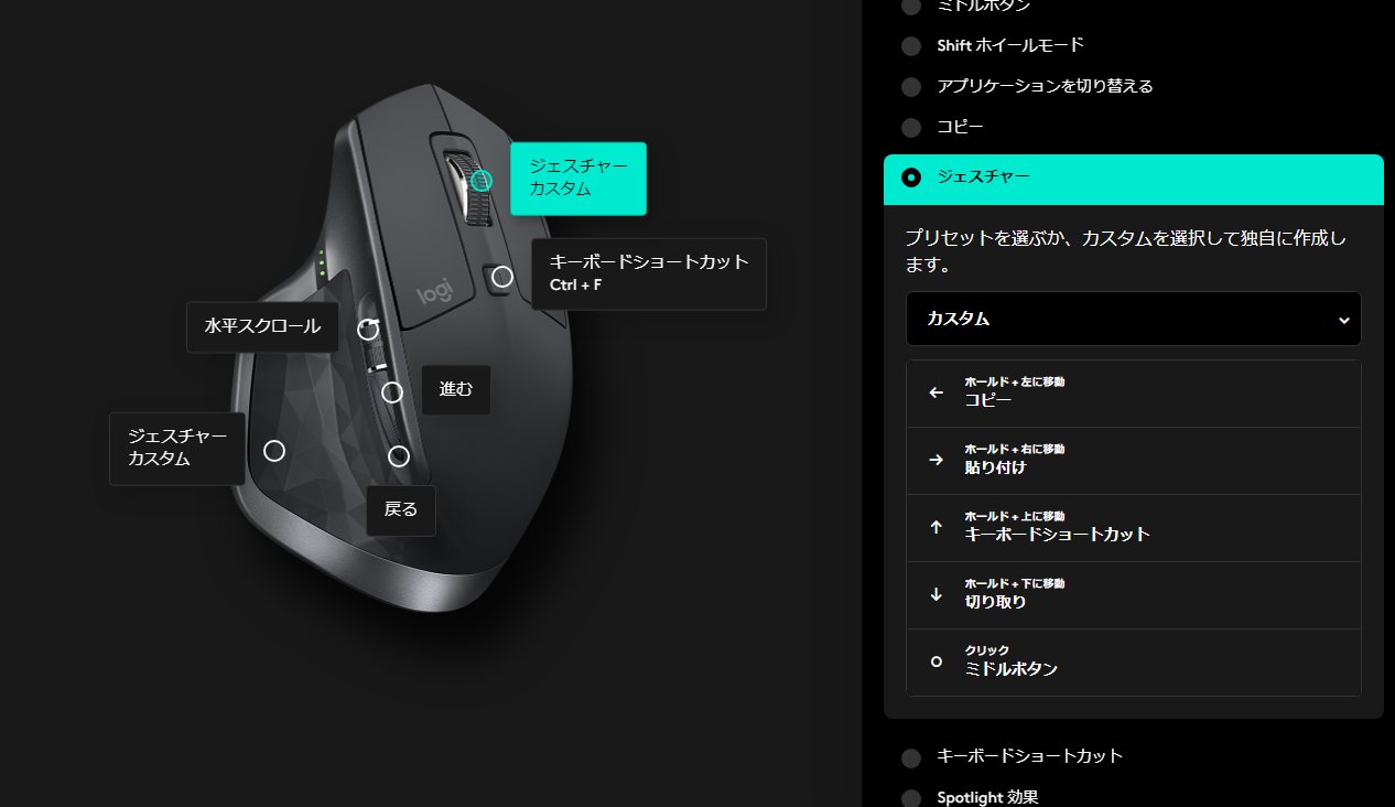 ▼Logicoolであれば「クリック」という操作項目が残ってて、それと比較するとどうにも物足りない感じ。今後のソフトのアップデートに期待したいところです。↓
