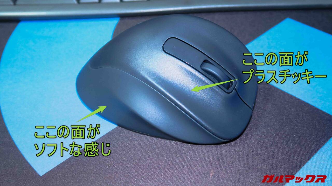 ▼また、親指・小指にあたる側面はソフトな質感でした。なので親指小指の部分は硬さを感じにくく、ここも快適さを感じられるポイントですね。画像にするとこんな感じ。パネルで分かれてる部分を境に質感が変わっています。↓