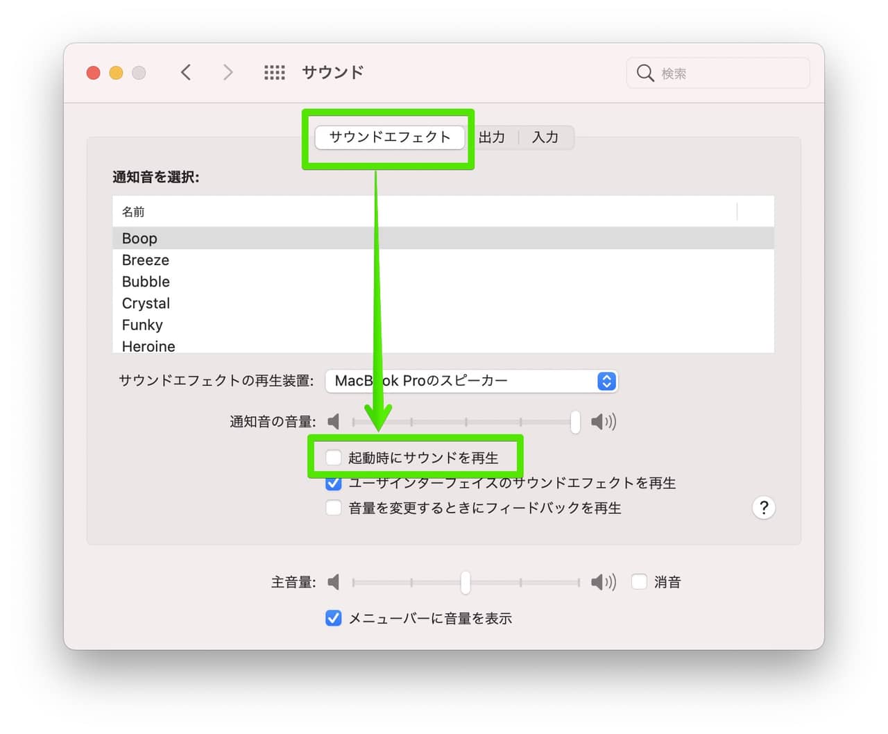 ▼サウンドエフェクトで「起動時にサウンドを再生」のチェックを外せば完了。↓