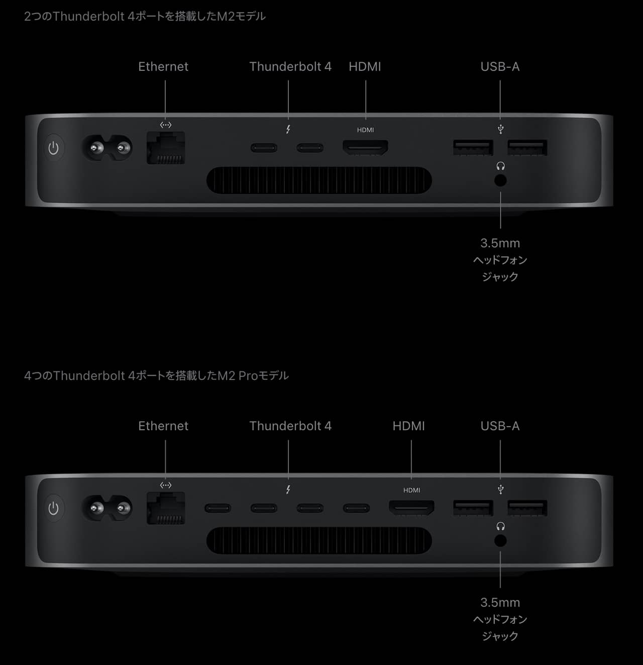 ▼M2搭載モデルとM2 Pro搭載モデルではポートの構成で違い有り。↓