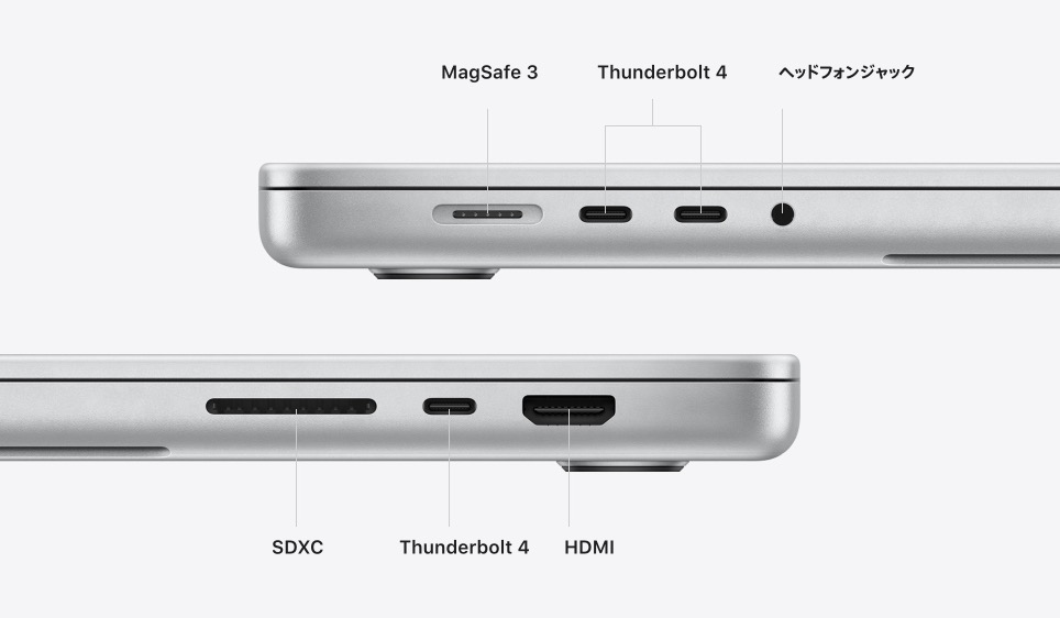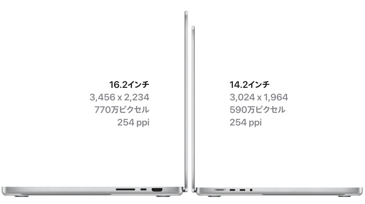 ディスプレイは14.2インチか16.4インチのLiquid Retina XDR。画面サイズは違うけど、どっちも画素密度は254ppiでノートパソコンとしては超高精細。