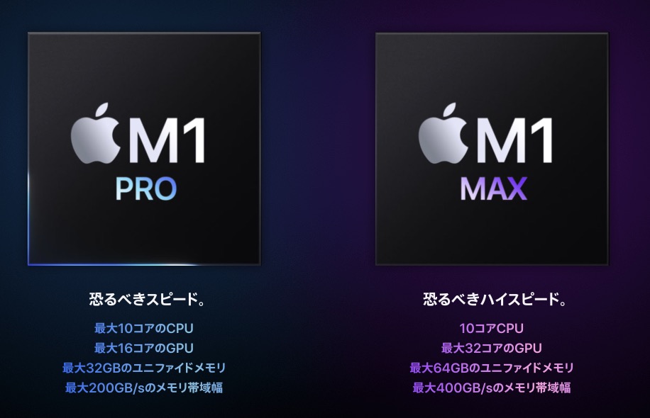 ▼で、新しく出た新型MacBook Proは更に性能アップした「M1 PRO」「M1 MAX」のいずれかを搭載。ちなみにPro<MAXって感じの性能です。↓