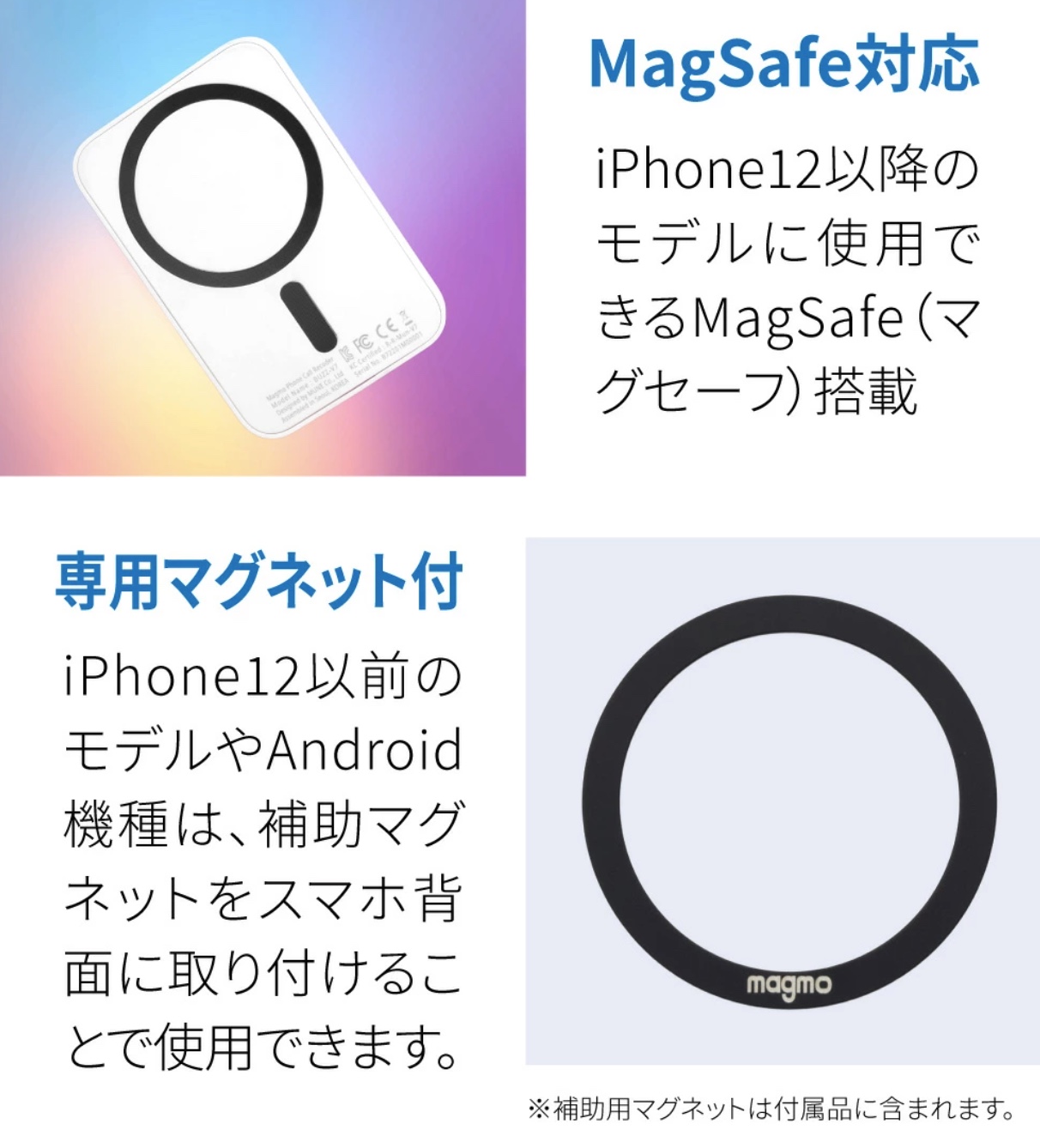 ▼本体にはマグネットが埋め込まれていて、MagSafe対応のiPhoneなら背面に磁石でペタっとくっつきます。MagSafe非対応のiPhoneやAndroidスマホは付属する補助用マグネットをスマホの背面に貼り付けることでくっつけられるとのことです。↓