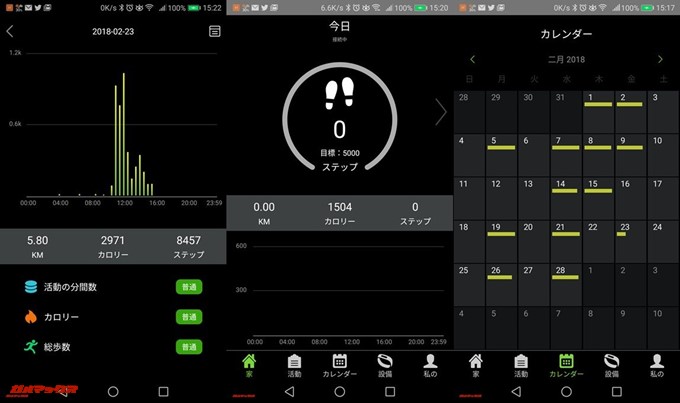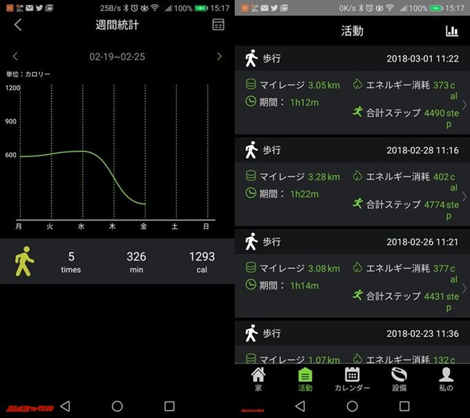 - 時計で計測できるモードの情報は同期可能、活動状況をスマートホンで確認できる。