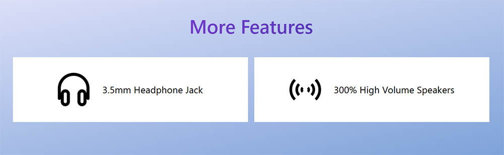 ▼ステレオスピーカー搭載、音量300%ブーストに対応しています。3.5mmオーディオジャックも搭載しています。↓
