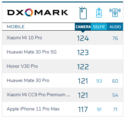 ▼これまでDxOMarkのカメラスコアは123点が最高得点で、それまではHUAWEIのMate 30 Proが首位に立っていました。Xiaomi Mi 10 Proが出るまでは。↓