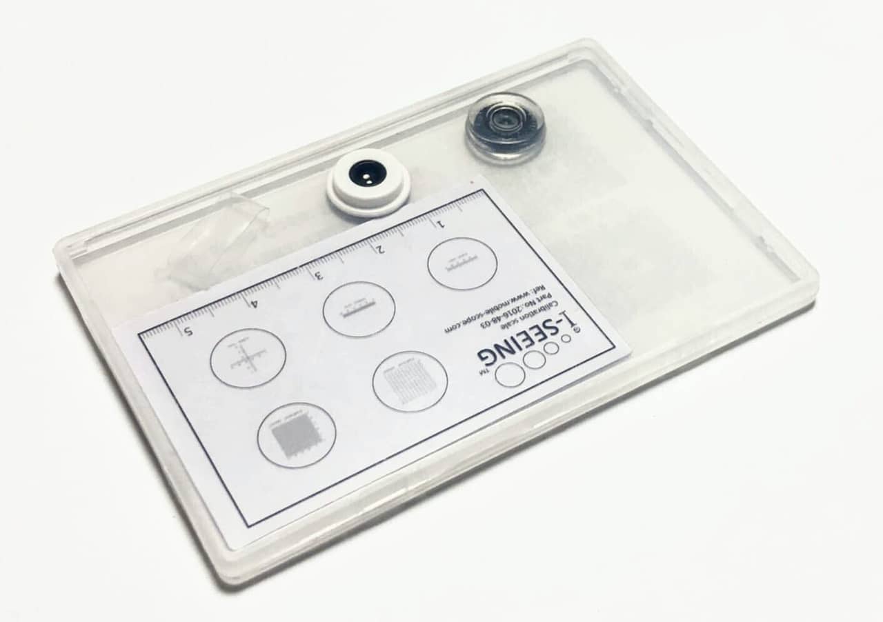 ▼ケースのサイズはカードサイズでかなりコンパクト!サイフにも入る設計。出先でもそこそこ使いやすそう、というかマジで持ち運べる顕微鏡って感じっす!↓
