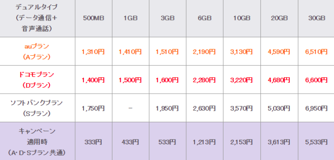 各キャリアのプランは若干価格差があるのですが、どのキャリアを選んでも月額333円となるように調整されています。