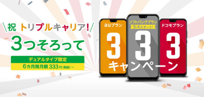 まず、①[祝 トリプルキャリア!3つそろって333キャンペーン]のキャンペーンですが、こっちはmineoがドコモ・au・ソフトバンクの3キャリア対応を記念したキャンペーンで、月額が半年間333円となるキャンペーンです。