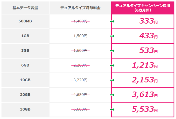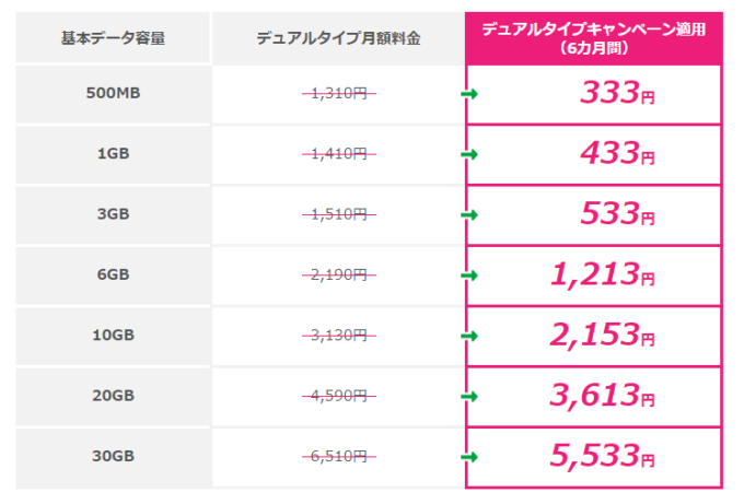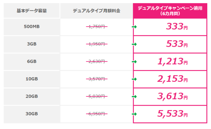 | 基本データ容量 | ②+①適応時の月額(半年間/音声通話) |