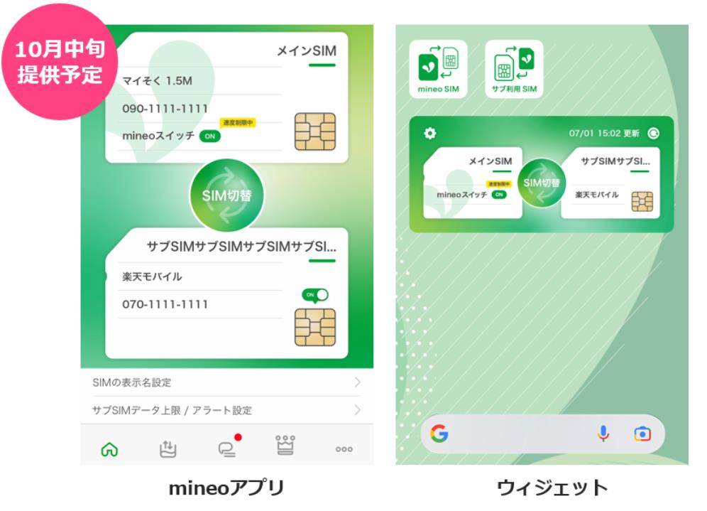 ▼さらにmineoは、10月中旬よりmineoアプリ上で簡単にSIMを切り替えできる機能を追加するそうです。これ、アプリ起動だけでなくウィジェットからも切り替えられるみたいで便利な予感!↓
